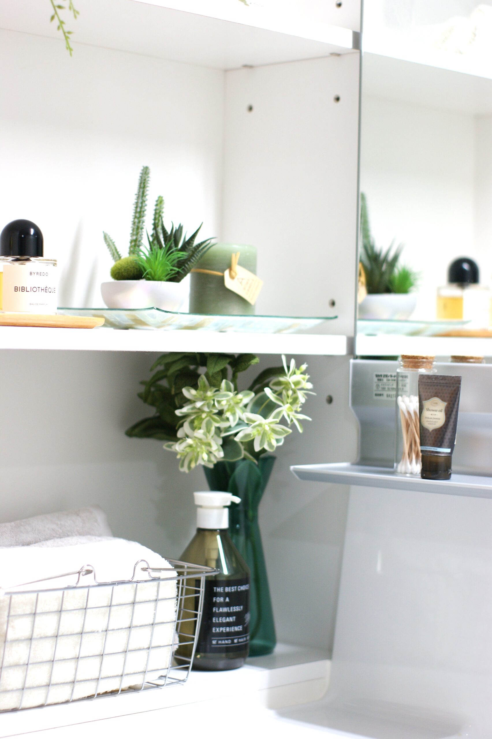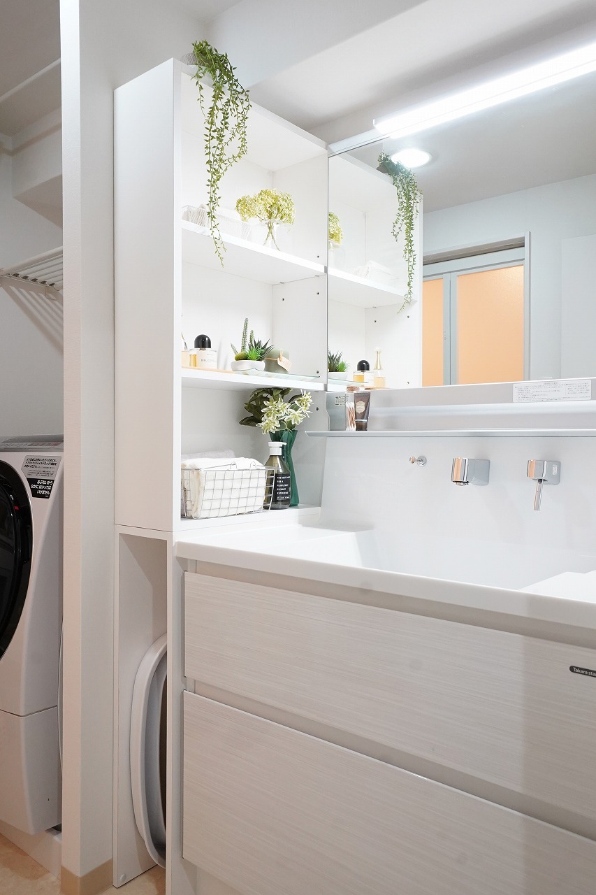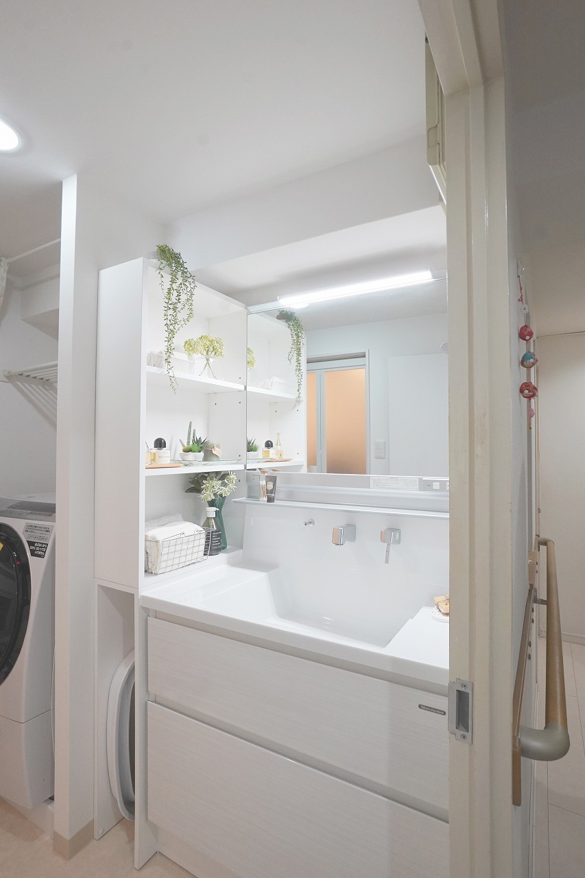 洗面化粧台は清潔感のある白をセレクト。物がぴったり収まるようキャビネットをオーダーで作りました。