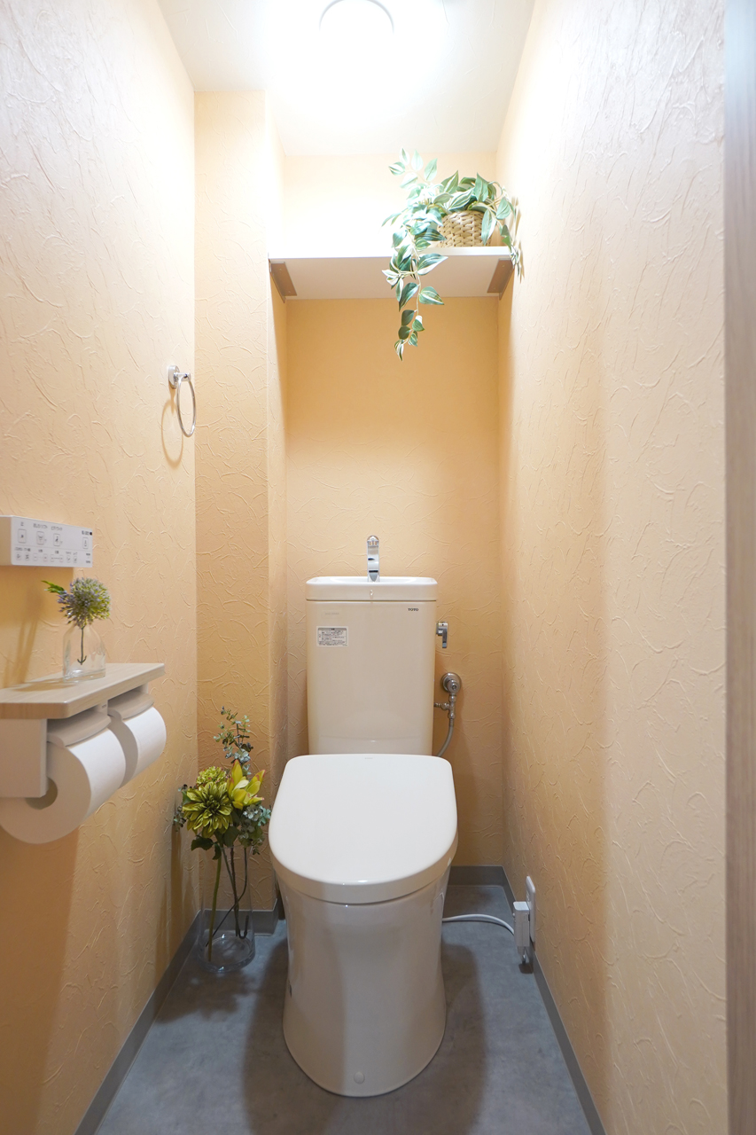 トイレは暖色系でまとめ、あたたかみのある落ち着いた雰囲気に。 小さな空間だからこそ、ほっとできる居心地の良さを大切にしました。