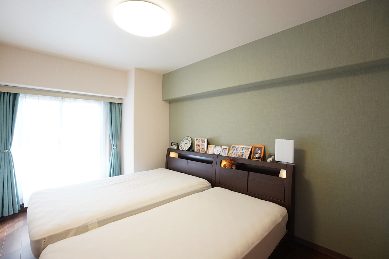 モスグリーンのアクセントクロスが、落ち着きと癒しをもたらし、心がふっと安らぐ雰囲気を演出しています。